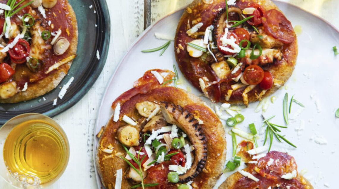 5 Grattugiate parte della ricotta sopra le pizze crude, poi trasferitele in forno a 240° per 10 minuti. Guarnite con il polpo e rimettete in forno per 5 minuti. Intanto mondate e affettate il cipollotto (bulbo e gambo insieme), affettate i datterini e conditeli con sale, olio, rosmarino, poi uniteli al cipollotto affettato.