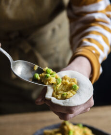 In una ciotola, mescolate la farina con le spezie e il sale, versate circa 1 dl di acqua, a sufficienza per ottenere un impasto liscio e compatto. Copritelo e fatelo riposare. In un'altra ciotola, schiacciate con una forchetta le patate, poi aggiungete tutte le spezie e le erbe aromatiche, mescolate bene e aggiustate di sale. Quindi unite i piselli e mescolate il composto delicatamente.