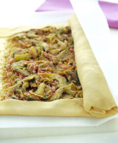 L'impasto fatto in casa è lavorato e steso in una sfoglia sottile prima di essere farcito con saporito prosciutto cotto, carciofi e il tocco croccante delle nocciole rosolate assieme al pancarré sbriciolato. Buono appena sfornato, questo strudel acquista ancora più sapore se gustato il giorno dopo.