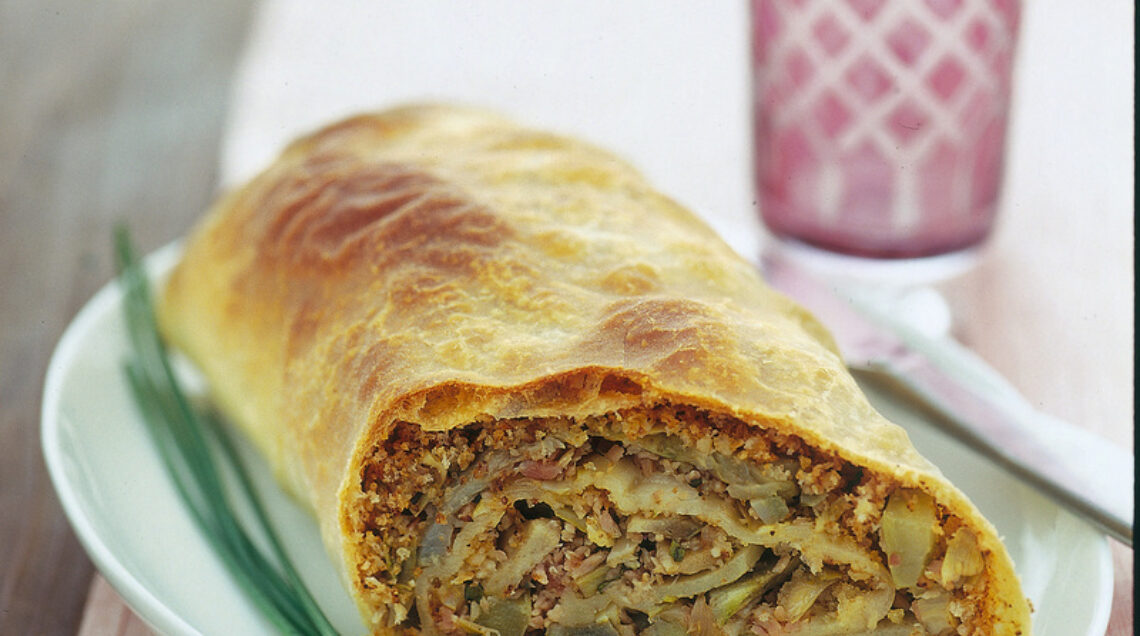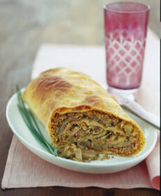 Una proposta con il pesce, lo strudel di baccalà e carciofi è servito con spuma al pepe; cremoso ripieno per lo strudel di cipollotti e crescenza, preparato con pasta sfoglia e arricchito dalle mandorle. Con ortaggi invernali, lo strudel di scamorza affumicata e radicchio.