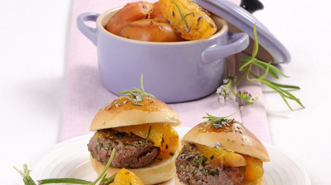 3) Infine cuoci gli hamburger in una padella con un cucchiaio d’olio, poi coprili con mezza albicocca caramellata e servili su del pane al latte tagliato a metà.