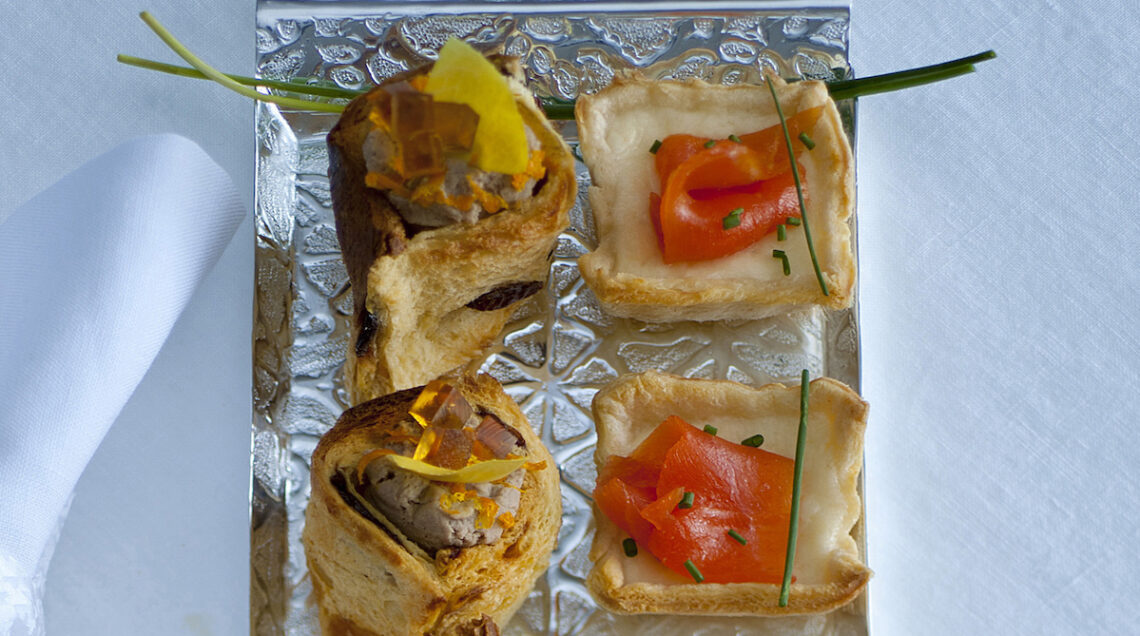 Le barchette di panettone, guarnite con paté di fegato all'arancia e indivia belga, sono tartine originali da gustare in un boccone, perfette per un buffet di Natale. Nella nostra proposta, sono servite insieme a semplici tartellette di sfoglia con crescenza, salmone affumicato ed erba cipollina.