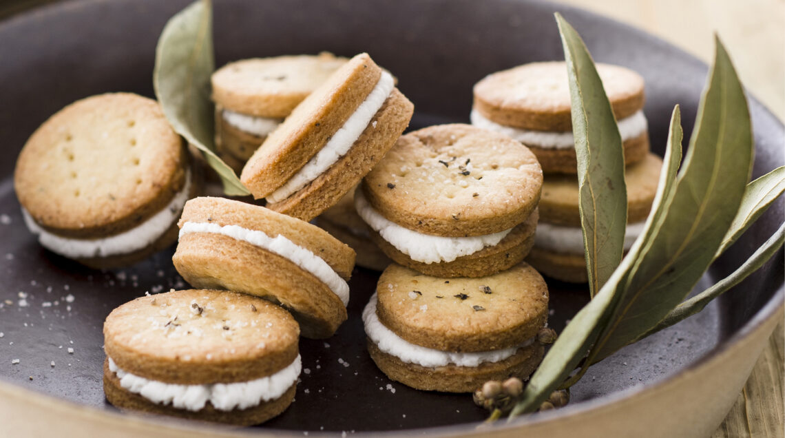 4 Togliete i biscotti dal forno e lasciateli raffreddare. Farcite metà con un ciuffetto di crema di robiola, coprite con i rimanenti e servite.