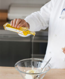 Raccogliete la robiola in una ciotola. Aggiungete un paio di cucchiaini di olio di nocciole, un pizzico di sale e pepe e mescolate bene l'impasto con un cucchiaino.