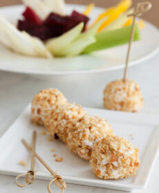 Raccogliete le nocciole tritate in un piatto fondo. Prendete una alla volta le palline di robiola e rotolatele nel piatto con le nocciole.