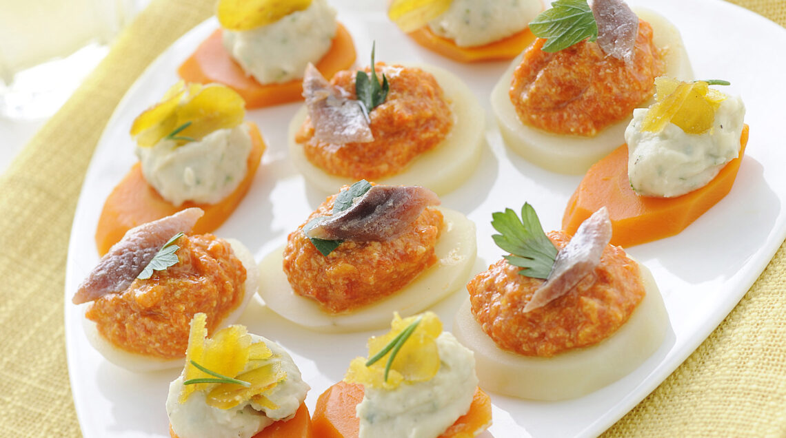 Private il peperone della pelle, dei semi e dei filamenti e frullatelo con un pizzico di sale, il pecorino e 1 cucchiaino d'olio. Suddividete la crema sulle fette di patate e completate con tocchetti di acciuga e prezzemolo. Disponete la mousse di fagioli sulle fette di carote, distribuite sopra fettine sottili di bottarga e servite.