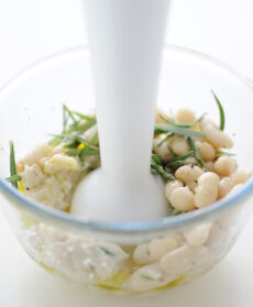 Raschiate le carote, sbucciate le patate. Tagliate entrambe le verdure a fette spesse 1/2 cm. Cuocete le patate con acqua fredda e sale per 7-8 minuti dall'ebollizione. Sgocciolatele e fatele raffreddare. Scottate le carote in acqua bollente salata, per 3-4 minuti, scolatele e tuffatele in una ciotola di acqua e ghiaccio per raffreddarle. Sgocciolatele e asciugatele. Abbrustolite il peperone sotto il grill del forno, rigirandolo su tutti i lati, mettetelo in un sacchetto per alimenti e lasciatelo raffreddare. Sgocciolate i fagioli, sciacquateli e asciugateli. Frullateli con qualche goccia di succo di limone, un pizzico di sale, uno di pepe e alcuni aghi di rosmarino.