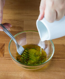 1. Inizia preparando la vinagrette: in una ciotola mescola l’olio, il succo di limone e un trito di timo e miscela con una forchetta per amalgamare il tutto.