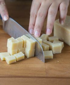 2. Taglia a cubetti di circa 1 cm il Parmigiano Reggiano: servirà come ripieno per le caramelle.