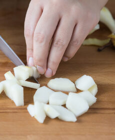 3. Dopo aver mondato le pere, sbucciale e tagliale a fettine sottili: serviranno ad accompagnare il Parmigiano Reggiano nelle caramelle.