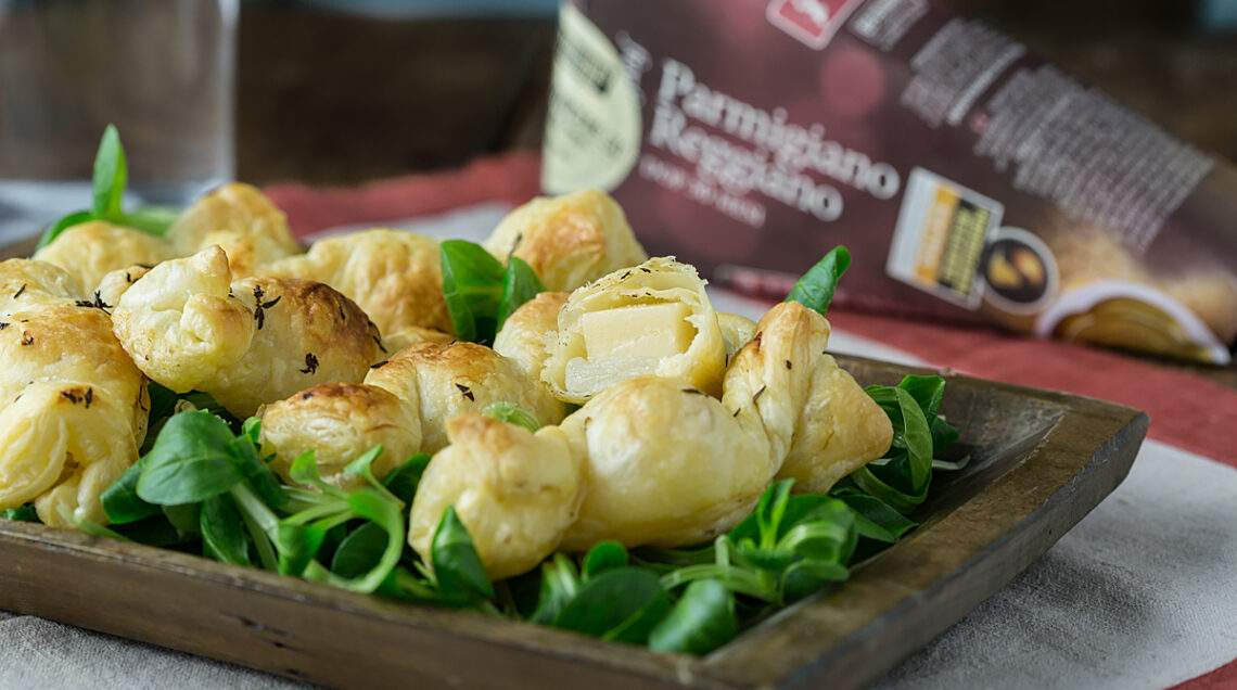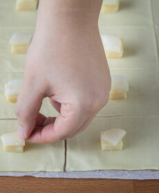 4. Stendi la pasta sfoglia e tagliala con una rotella da pizza in tanti rettangoli di 4x6 centimetri. Poi, adagia un cubetto di Parmigiano e una fettina di pera al centro di ogni rettangolo.