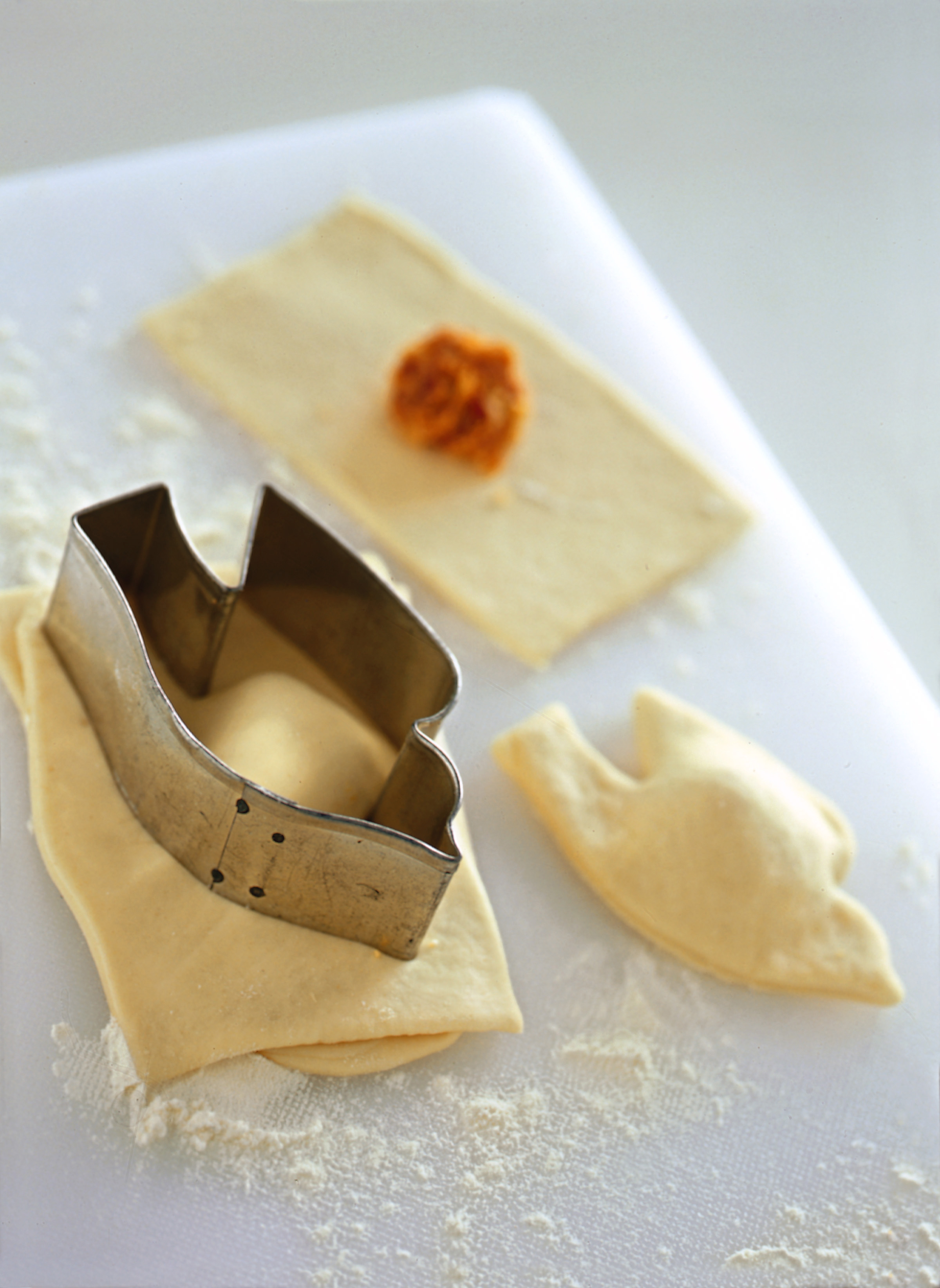 3) Stendi l’impasto e farcisci. Dividi la pasta in panetti più piccoli e stendili con l’apposita macchina in strisce aventi uno spessore di circa 2 mm. Dopodiché forma delle palline grandi come una nocciola con il trito aromatico precedentemente ottenuto e distribuiscile su metà delle strisce di pasta a intervalli di circa 10 cm. A questo punto inumidisci la pasta intorno al ripieno, copri con le altre strisce e fai aderire bene i 2 strati pressando bene i bordi per sigillarli. Quindi ritaglia tante colombine aiutandoti con un tagliapasta sagomato lungo 9 cm. Il procedimento è più o meno lo stesso utilizzato per i ravioli.