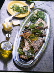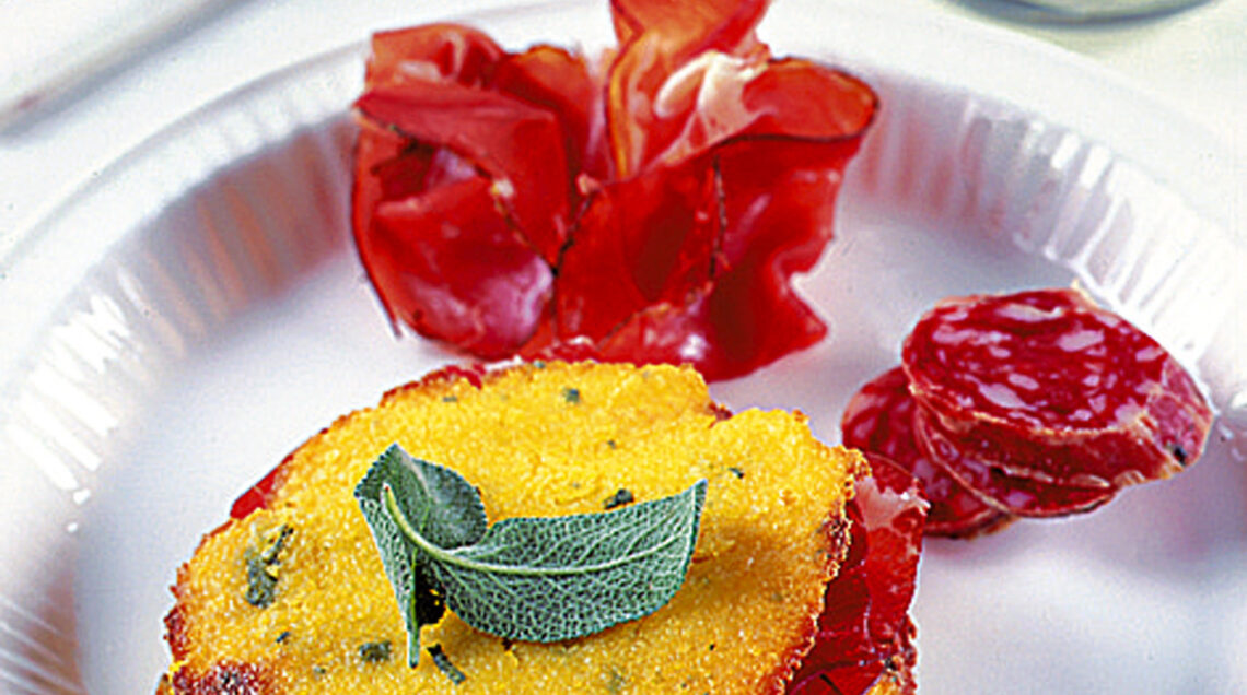 3) A questo punto lascia raffreddare i dischetti di polenta, poi disponi su ognuno un fiocchetto del burro rimasto e trasferisci i fogli di carta da forno su due placche. Infine inforna e abbrustolisci la polenta sotto il grill per 7-8 minuti, poi quando sarà sufficientemente croccante e dorata toglila dal forno e servila con i salumi a parte, nello specifico la coppa, lo speck e il salame piccante, in modo da formare dei piccoli sandwich.