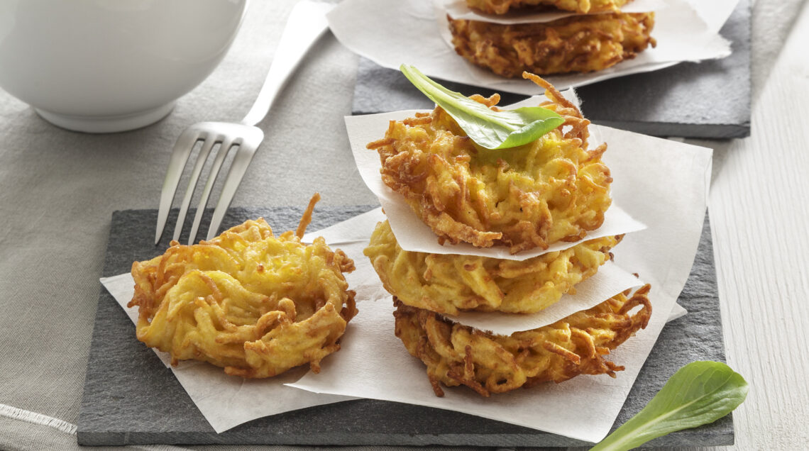 3 Incorporate la pastella al mix di capelli d'angelo; aiutandovi con un cucchiaio, fate cadere il composto in una padella con abbondante olio di semi ben caldo e formate le frittelle.