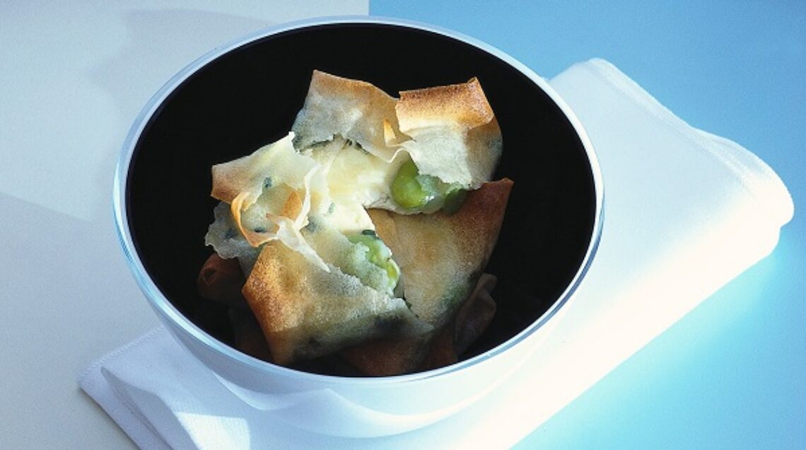2 Allineate sul piano di lavoro le sfoglie per gli involtini primavera. Disponete al centro di ognuna un mucchietto di fave e un mezzo crottin. Chiudete gli angoli a fagotto sigillandoli con un velo d'acqua.