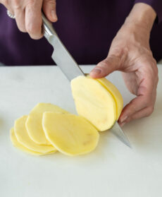 Lavate le patate, sbucciatele e affettatele a uno spessore di circa 1/2 cm.