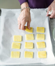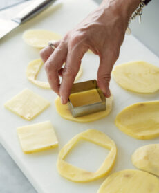 Con l'aiuto di un coppapasta quadrato di circa 4 cm di lato tagliate le patate a quadrati, tenendo da parte qualche fetta da cui ricaverete una decina di quadrati più piccoli, di circa 3 cm di lato.