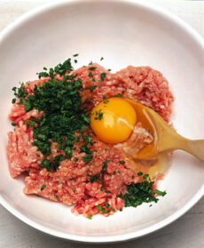 Mescolate la carne in una grande ciotola, con un uovo, un pizzico di cannella e una grattatina di noce moscata. Tritate finemente uno spicchio di aglio e un ciuffo di prezzemolo, il pepe e uniteli alla carne. Incorporate bene tutti gli ingredienti e regolate con un pizzico di sale.