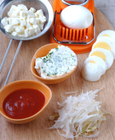 Tagliate la mozzarella a dadini e sgocciolateli, e l'indivia a listarelle. Passate al passaverdure i pomodori. Affettate le uova. Incorporate ai formaggi cremosi le erbe tritate (erba cipollina e prezzemolo), sale e pepe.