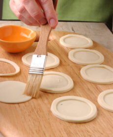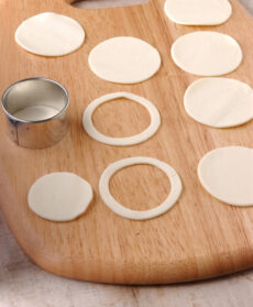 Ricavate dalla pasta sfoglia tanti dischetti con il tagliapasta più grande. Poi, con quello più piccolo, ritagliate metà dei dischi , in modo da ottenere altrettanti anelli di pasta.