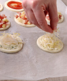 Disponete le pizzette preparate sulla placca foderata con carta da forno bagnata e strizzata. Cuocetele per circa 10 minuti in forno caldo a 200°. Estraete la placca dal forno e suddividi i dadini di mozzarella sulle pizzette con il pomodoro,