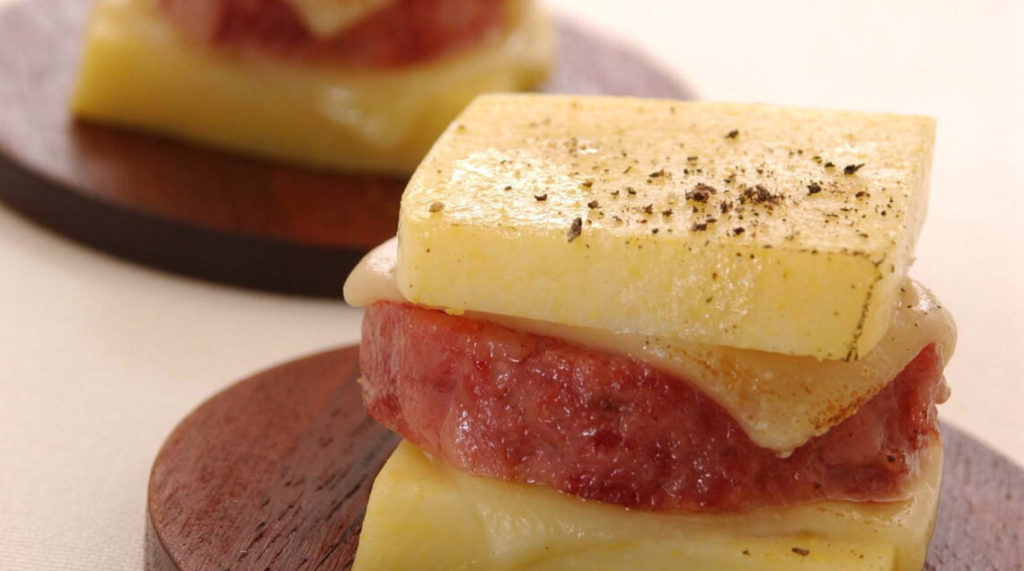 1) Farcisci 16 fette di polenta già pronta, a 2 a 2, con una rondella di zampone e una fettina di fontina valdostana.