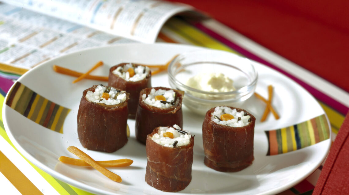 2 Tagliate la carota a bastoncini e scottateli in acqua bollente per 2-3 minuti; fatele intiepidire. Stendete su un foglio di pellicola trasparente metà della bresaola e distribuitevi metà del rafano. Distribuite sulla bresaola 100 g di riso tiepido o freddo e metà dei bastoncini di carota.
