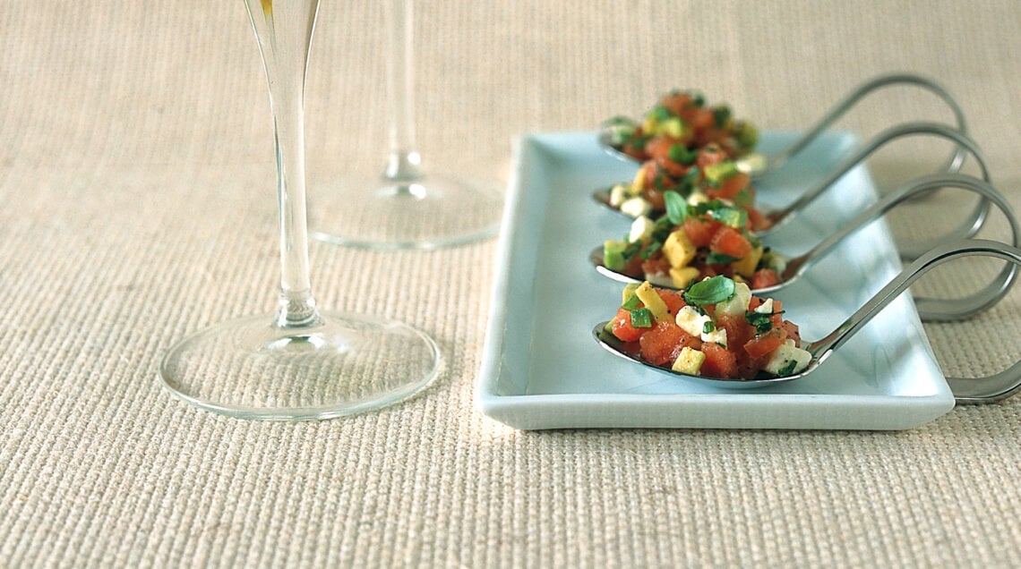 2) Mescola la tartare di pomodoro e avocado e suddividila in cucchiai appoggiati su un vassoio da portata o, in alternativa, in foglie tenere di indivia belga.