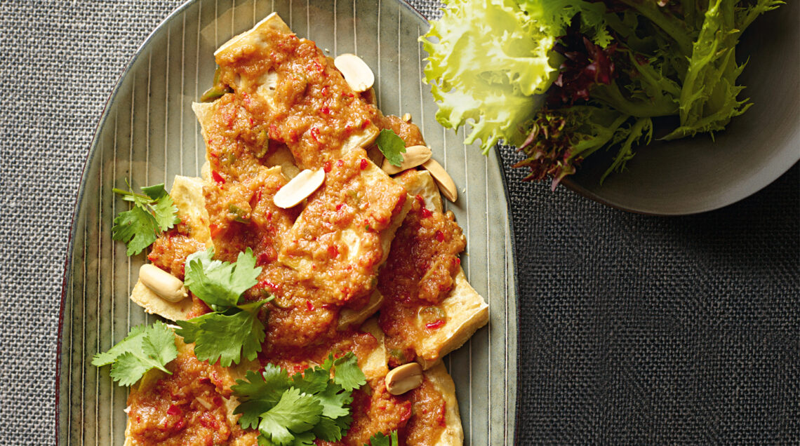 4 Versate la salsa sul tofu e guarnite, se vi piace, con arachidi intere e foglie di coriandolo o di prezzemolo.