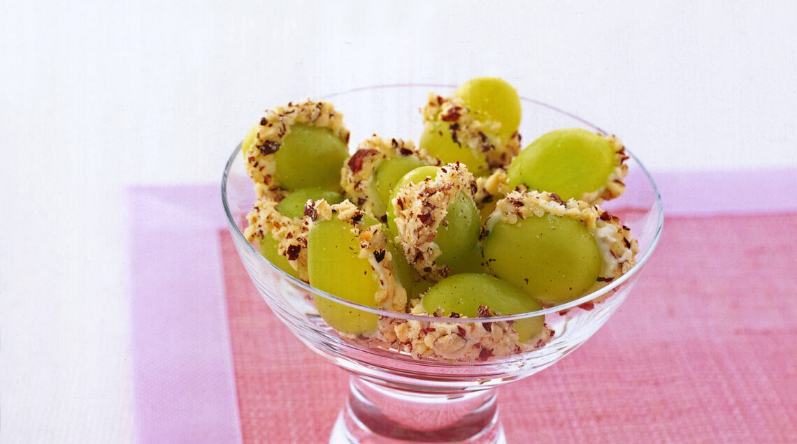 5) Disponi l'uva con la crema di formaggi su un vassoio, distanziando bene gli acini, e metti in frigorifero per mezz'ora.