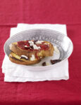 3) Tosta il pane in forno per 5 minuti. Distribuiscici sopra la zucca con il suo sugo e guarnisci con la pancetta, qualche ago di rosmarino e una fettina di formaggio di capra per ogni fetta.