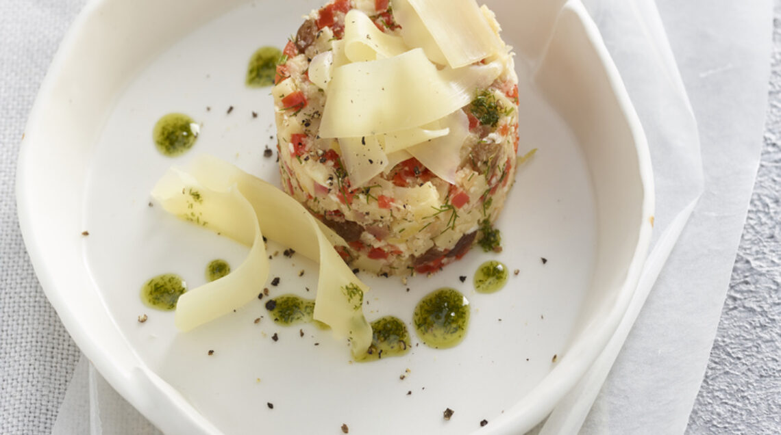 Protagonisti di questa tartare Emmentaler dop, cavolfiore e peperoni sono accostati con note agrodolci, tipiche del connubio tra aceto di mele e uvetta, cipolla e zucchero di canna. Il pesto di finocchietto rende unico un piatto vegetariano apprezzato da tutti, buono non solo come aperitivo.