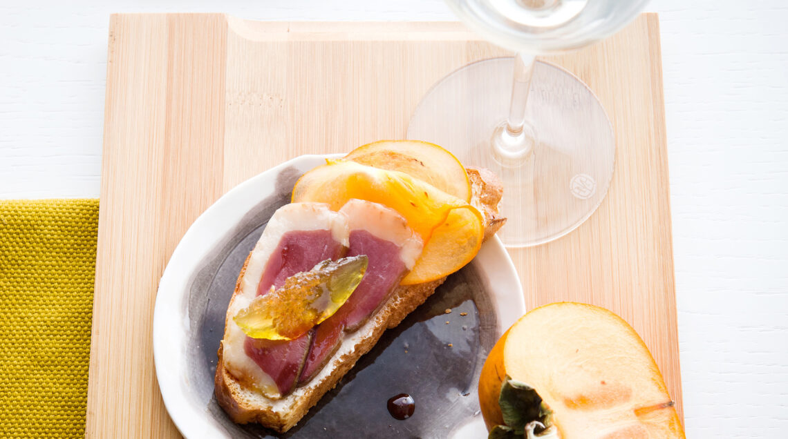 2) Lava il cachi mela e riducilo in fette molto sottili. Taglia i fichi a spicchi. Spalma le fette di pane con il paté d'anatra, aggiungi un paio di fettine di cachi, due fette di petto d'anatra affumicata e uno spicchio di fico. Completa con qualche goccia di aceto ridotto. La tua anatra affumicata e fichi è pronta per essere servita.