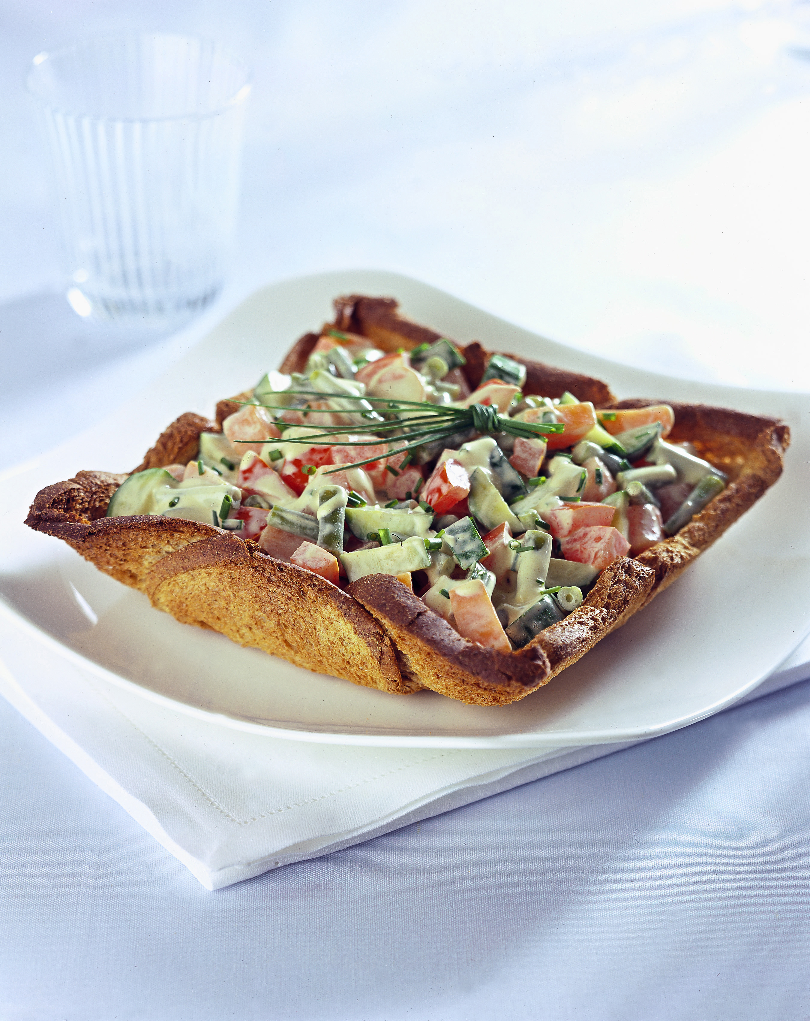 Colori e sapori vivaci per questo antipasto vegetariano a base di pancarré e ortaggi, condito con yogurt e senape