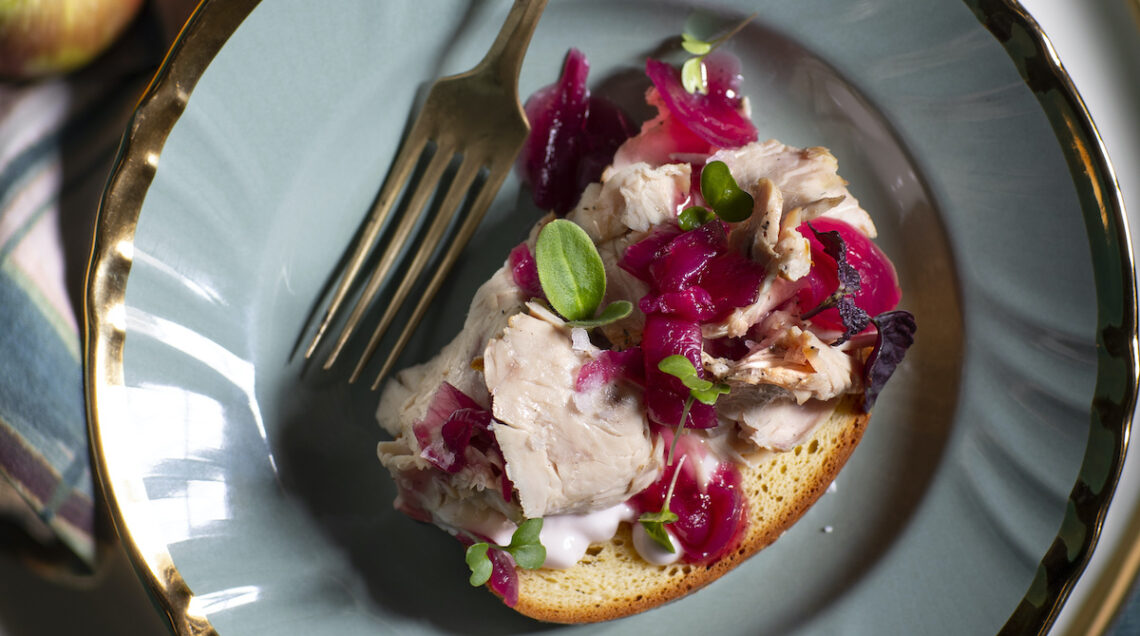5 Tagliate il pan brioche a fette e tostatele leggermente in forno. Affettate il tacchino. Spalmate il pane con la crema di cipolla, distribuitevi la carne e le cipolle caramellate tenute da parte, condite con qualche goccia d’olio, decorate con i germogli e servite.
