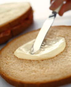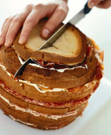 A questo punto distribuisci tra il primo e il secondo disco di pane, a cominciare dal basso, spalmando i lati interni con la crema di burro.