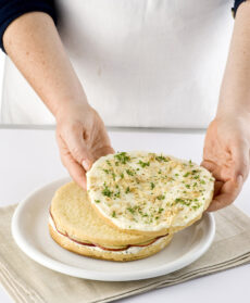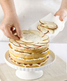 Spalmate la crema di formaggio sul terzo disco, cospargetela con la polpa di arancia e pepe nero e coprite con il quarto. Appoggiate la coppia di dischi su quelli di base, per ricomporre il panettone. Spalmate il quinto disco con il formaggio di capra, disponetevi sopra la cotognata a fette sottili e pepe nero; coprite con il sesto.