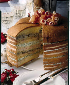 Spremete il succo di 1 piccolo lime ed emulsionatelo con un filo d’olio, un pizzico di zenzero fresco grattugiato, 1 cucchiaino di scalogno spellato e tritato finissimo, bacche di pepe rosa leggermente pestate e una macinata di pepe bianco. Lavorate a crema 150 g di formaggio fresco spalmabile, profumatelo con foglioline di menta spezzettata e con 1 cucchiaino di scorza di lime grattugiata. Spalmate la crema su un disco di panettone, aggiungete 120 g di fettine di tonno affumicato e condite con l’emulsione preparata. Coprite con un secondo disco.