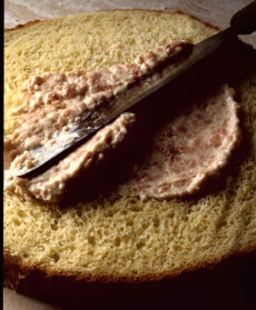 Sgocciolate 6 filetti d’acciuga dall’olio di conservazione e divideteli a metà nel senso della lunghezza. Spalmate un disco di panettone con 150 g di formaggio stracchino freschissimo. Aggiungete i filetti di acciuga e una spolverizzata di prezzemolo tritato molto fine. Completate con 100 g circa di salame a fette sottili. Coprite con un secondo disco.