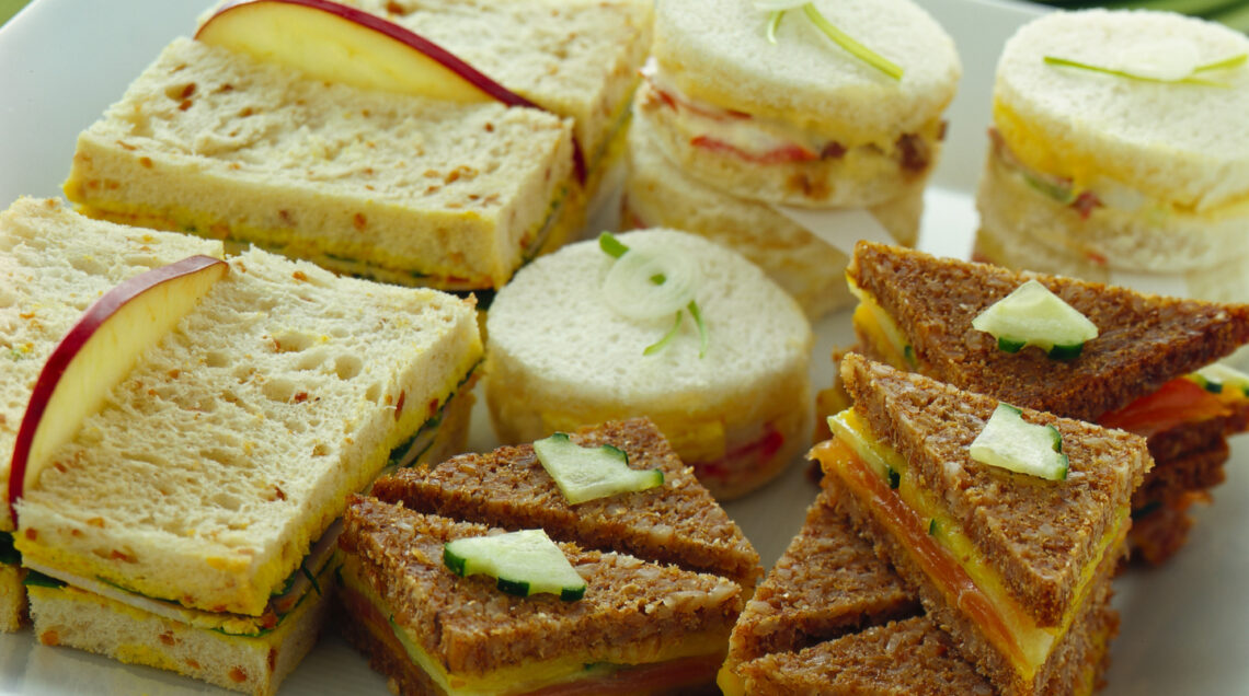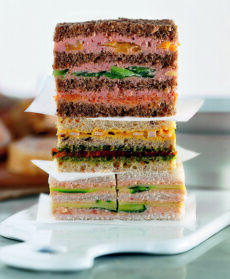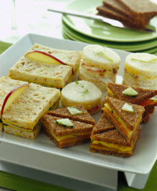 4) Solleva delicatamente i tramezzini con una paletta, sistemali, uno accanto all'altro, su un piatto da portata e inframmezza i rettangoli con tacchino e salsa al curry con le fettine di mela.