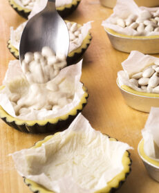 Premi leggermente con le dita all'interno degli stampini per far aderire la pasta, taglia via la pasta in eccesso, copri le tartellette milleforme con foglietti di carta da forno inumidita e fagioli secchi.