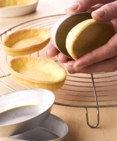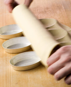 Trascorso questo tempo riprendi la pasta, stendila sulla spianatoia infarinata con il matterello, sempre infarinato, allo spessore di 3-4 mm. Disponi uno accanto all'altro tanti stampini imburrati di tartellette (possono essere rotondi, ovali o rettangolari, a bordi lisci o smerlati), svolgici sopra la pasta.