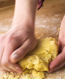 In un’altra terrina sbatti i tuorli con l’aggiunta di 2 cucchiai di acqua fredda, poi aggiungili alla farina e burro. Continua ad impastare fino ad avere una pasta liscia e omogenea a cui devi dare la forma di una palla. Mettila in frigorifero a riposare per 30 minuti.