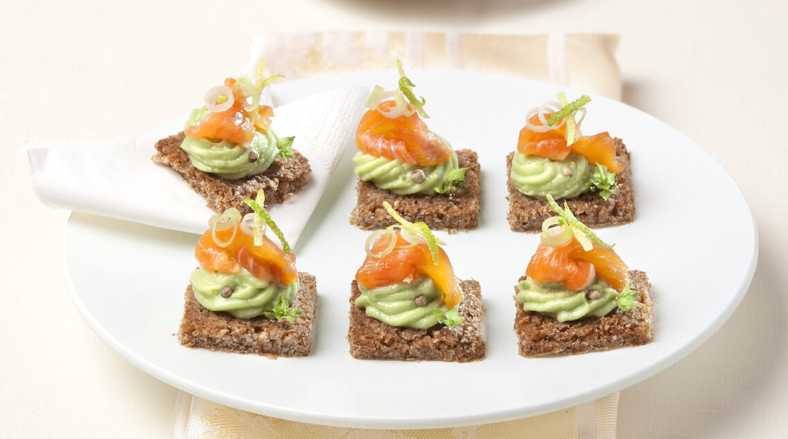 Deliziose tartine con morbida mousse di avocado e saporito carpaccio di salmone. Un antipasto light golosissimo e raffinato