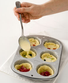 Estrai le tortine sfiziose dal forno, farciscile con le verdure, le uova e la panna e inforna per altri 15 minuti.