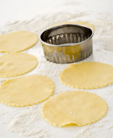 Metti la pasta delle tortine sulla spianatoia infarinata e stendila fino allo spessore di 3-4 mm; con l'aiuto di un tagliapasta dentellato del diametro di 7-8 cm ricava dalla pasta tanti dischi, che devi ampliare allargandoli con il matterello.