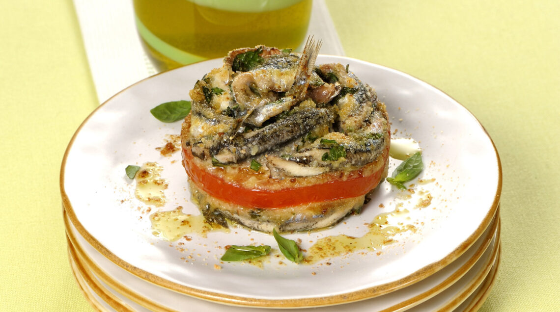 3 Disponete sul fondo di ogni anello 3 alici, condite con pepe, un cucchiaino di parmigiano grattugiato e coprite con una fetta di pomodoro; completate i tortini con altre 3 alici ciascuno, una spolverata di pangrattato, poco pepe e un cucchiaio di olio che vada a condire tutti gli strati.