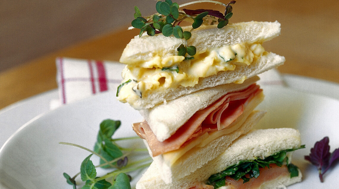 3) Completa il tris di tramezzini. Chiudi le fette di pane farcite con le fette restanti e pressa un po’ con il palmo della mano per farle aderire bene; taglia con un coltello affilato i sandwich ottenuti in tanti tramezzini e decorali prima di servirli con i germogli di crescione.