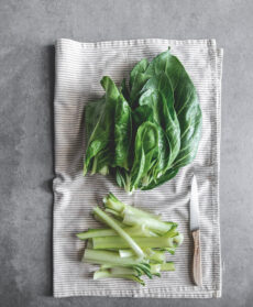 Lavate le coste e separate la parte a foglia dai fusti centrali. Scottate le foglie per 20 secondi in acqua bollente salata, scolatele, immergetele brevemente in acqua fredda e sgocciolatele di nuovo. Lessate i fusti per 10 minuti in acqua bollente salata, scolateli e tritateli grossolanamente.