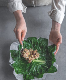Rivestite una teglia di 22 cm di diametro con carta forno bagnata e strizzata, oliatela e rivestitela con metà delle foglie sbollentate lasciandole sbordare. Unite metà del ripieno pareggiandolo bene, coprite con metà delle foglie rimaste, il ripieno restante e le foglie rimaste; ripiegate le foglie che sbordano verso il centro. Ungete la superficie dello sformato con olio e coprite con un disco di carta forno bagnata e strizzata. Infornate a 180° per 40 minuti.